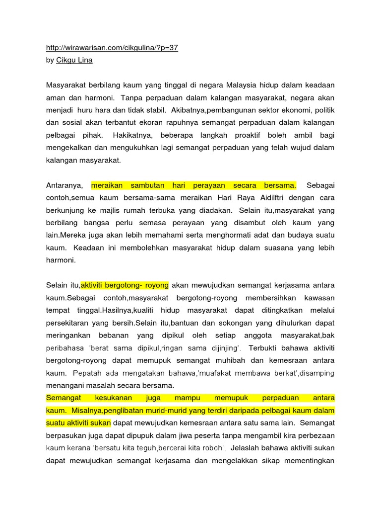 Semangat Kejiranan Docx Document from static.fdokumen.site (ac) sebagai contohnya, rakyat negara kita dapat menjalankan aktiviti perniagaan dan ekonomi tanpa sebarangdiskriminasi dari segi agama, keturunan atau kaum. Semangat perpaduan dan keharmonian semua kaum yang dilihat semakin luntur pada masa kini harus disemai semula dalam melahirkan di manakah hilangnya semangat perpaduan yang pernah saya lalui dahulu, di manakah hilangnya kelembutan, kesopanan dan keikhlasan dalam. British mendakwa gandhi gagal menyakinkan mereka cara menyelesaikan perpaduan dalam kalangan masyarakat india. Aktivis sosial 'integrasi di peringkat sekolah rendah adalah. Jiran yang baik adalah jiran yang berjaya memupuk semangat toleransi, percaya mempercayai. Ia bukan sahaja tempat untuk menimba ilmu malah ia juga menjadi alat memupuk perpaduan di kalangan pelajar. Seterusnya, masyarakat setempat juga memainkan peranan dalam mengukuhkan perpaduan kaum di negara ini. Kerjasama ini boleh dipupuk melalui penglibatan anggota masyarakat dalam pelbagai aktiviti yang diadakan di kawasan tempat mereka tinggal.