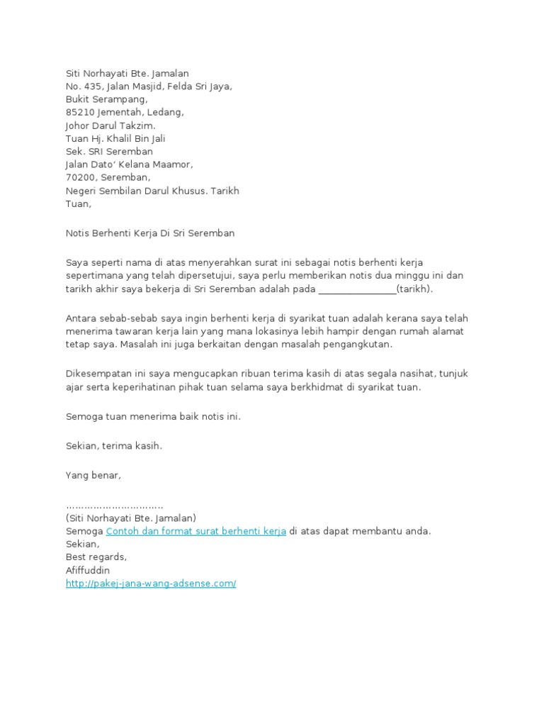 Jika mahukan contoh lain yang lebih lagi dalam bahasa inggeris boleh rujuk indeed di sini. 22 jalan ab kolam air 80200 johor bahru johor darul takzim. They are so many great picture list that may become your motivation and informational reason for contoh surat perletakan jawatan sambung belajar design ideas for your own collections. For more information and source, see on this link : Tarikh pengurus nama syarikat alamat syarikat tuan puan notis berhenti kerja di nama syarikat.