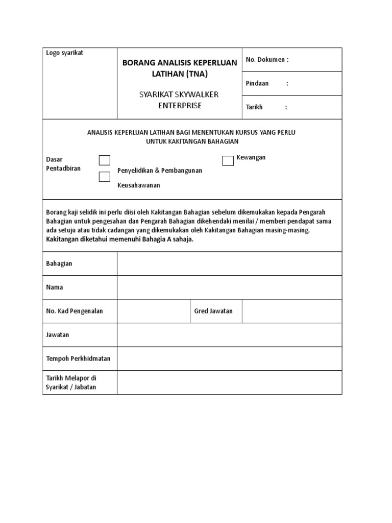 Maksud Analisis Keperluan Latihan : Kertas kerja ini menggariskan objektif utama kajian iaitu melihat. Penerangan terhadap prosedur yang dipinda akan diberikan kepada staf yang menguruskan latihan. • penilaian yang adil dapat membaiki prestasi kerja lemah, mengenalpasti keperluan latihan, perbicaraan disiplin yang adil. Entahlah, hasil dari pemerhatian selama ini saya dapati tidak ramai organisasi yang melaksanakan analisis keperluan latihan (tna) bagi membangunkan sumber manusia mereka. 2.4 definisi analisis keperluan latihan 28. Analisis keperluan latihan juga merupakan satu pendekatan sistematik untuk mengenalpasti keperluan latihan bagi pekerja tertentu.